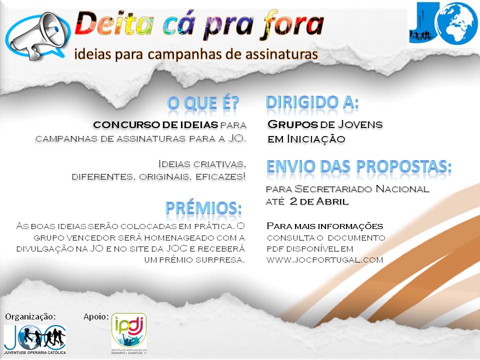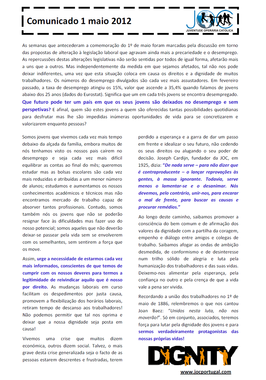 A JOC vai assinar o Dia do Trabalhador com encontros nas cidades de Lisboa e Aveiro, uma atividade que decorrer no âmbito da campanha europeia ‘Dignity’ (dignidade), iniciada em 2010.